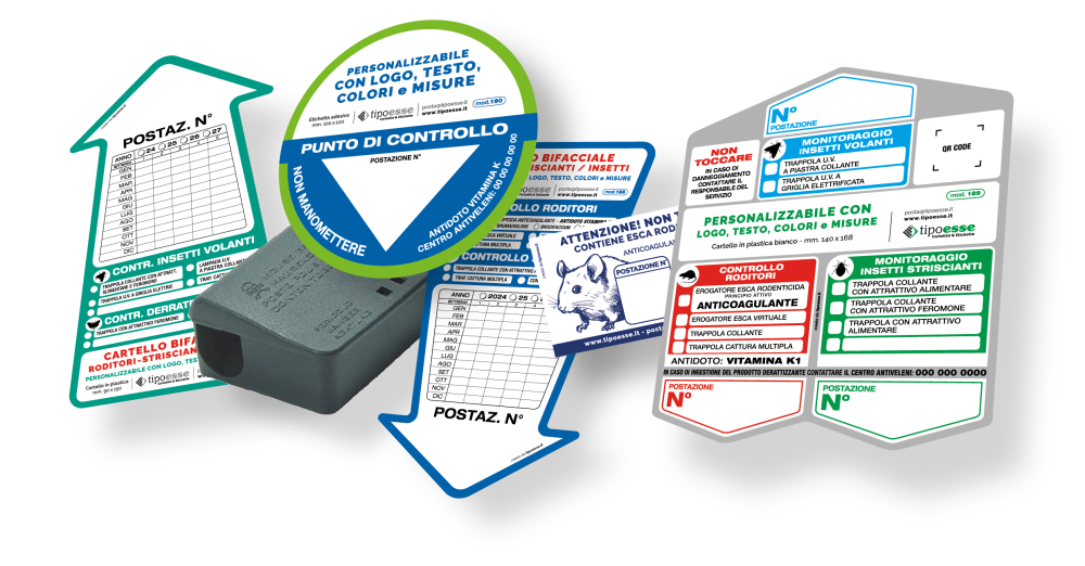 Utilizziamo materiali plastici con protezione ai raggi UV e resistenza alle intemperie. La gamma dedicata alla disinfestazione include Cartelli da parete per postazioni di monitoraggio, Etichette adesive per le trappole e/o piastrelle, cartelli ed etichette per pali, fascicoli e/o blocchi rapporto di intervento, etichette con tecnologia QrCode per la geolocalizzazione delle postazioni e molto altro…