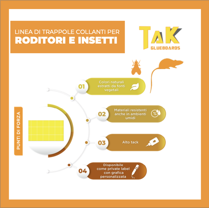 Tak is a line of glueboards and traps designed for monitoring and controlling pest insects and rodents. It is entirely produced in Italy by Ekommerce and is also available as a private label.